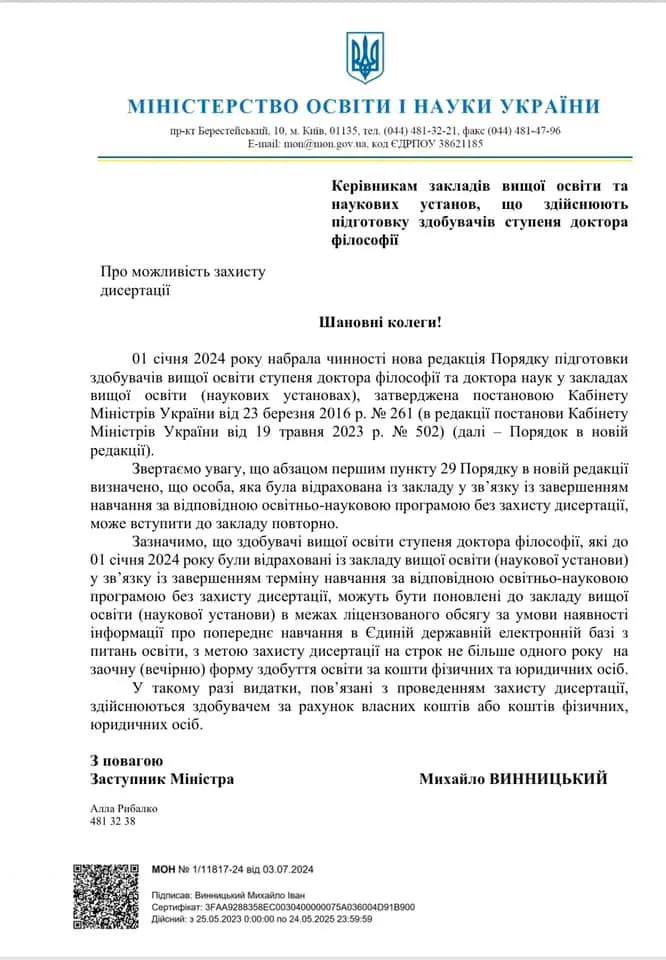 Об этом сообщается в письме Минобразования, которое публикует проректор Сумского аграрного университета Юрий Данько.