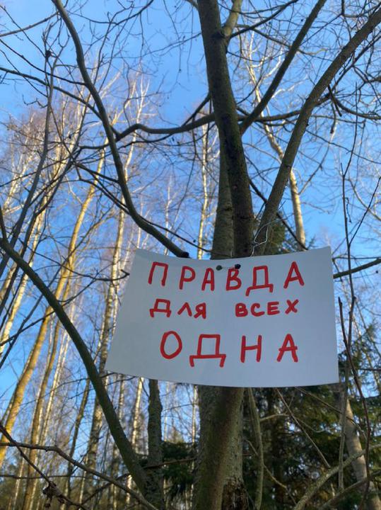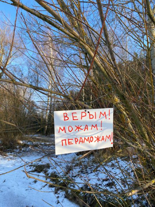 Местное издание TUT.by сообщает, что под Минском в лесу появились плакаты с известными уже слоганами: "Правда для всех одна", "Верим, можем, победим", "Мы вместе - нас много", "Наша возьмет".
