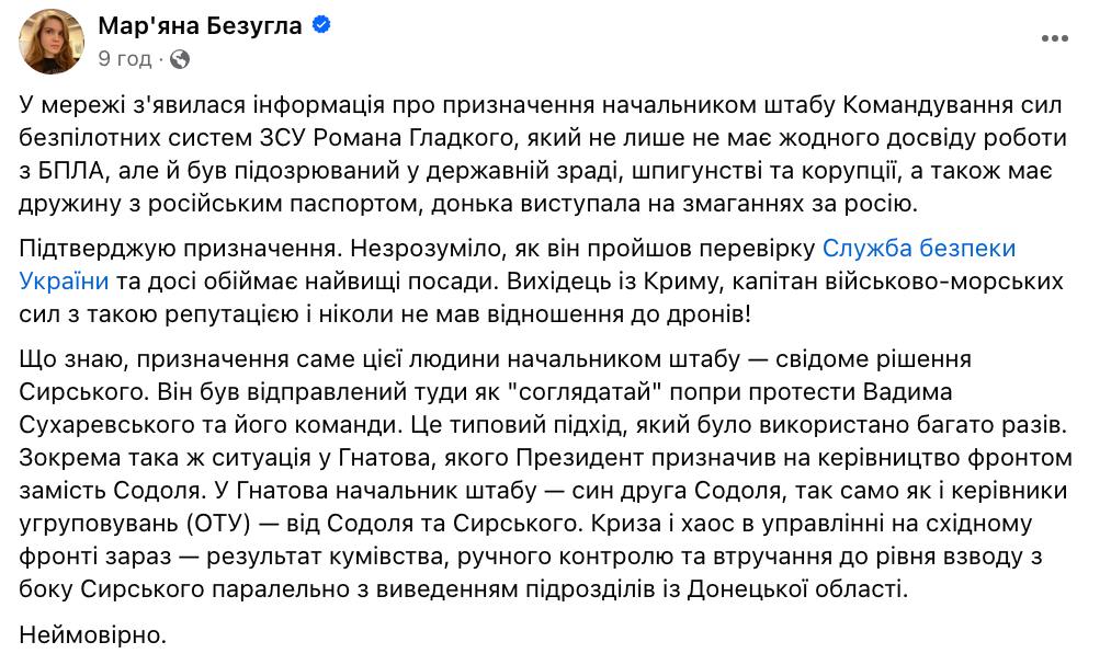 Народная депутат Марьяна Безугла раскритиковала назначение начальником штаба Командования сил беспилотных систем ВСУ Романа Гладкого, не только не имеющего никакого опыта работы с БПЛА, но и подозреваемого в государственной измене, шпионаже и коррупции.