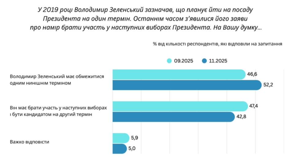 По результатам опроса "Социополис", 52,2% украинцев считают, что Владимир Зеленский не должен участвовать в следующих президентских выборах. Опрос проводился с 18 по 24 ноября 2025 года среди 1007 граждан.