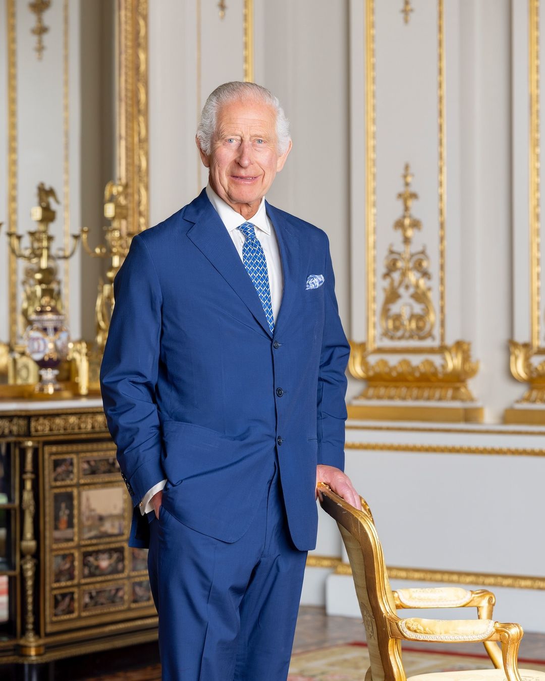 На снимке Чарльз улыбается, одетый в синий костюм, а его рука опирается на золотой стул. Фото сопровождается поздравлением: "Сегодня мы поздравляем Его Величество Короля с Днем рождения".