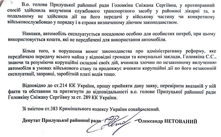 Больше всех поступок чиновницы Снежаны Головкиной возмутил депутата Прилуцкого районного совета Александра Нетованного. Он пошел дальше разговоров и обратился с заявлениями в полицию. Свои обращения обосновывает так: «Несмотря на тот факт, что имущество было передано больничному учреждению в 2020 году сроком на пять лет по безотзывному договору, исполняющая обязанности председателя Прилукского районного совета Головкина Снежана Сергеевна воспользовалась правом для истребования транспортных средств во время военного положения. Без составления акта об изъятии транспортного средства, без каких-либо правовых оснований, Головкина забирает автомобиль во время войны у медицинского учреждения и, несмотря на утвержденное мобилизационное задание, а также потребности во внедорожниках на передовых военных позициях, Головкина, пользуясь своим должностным положением, продолжает использоваться в указанном порядке. Важно, что после изъятия автомобиля в районной больнице, автомобиль не передан в Прилукский РТЦК и СП, а продолжает, вопреки мобилизационной задаче и требованиям законодательства о передаче имущества из районного совета, использоваться для собственных нужд исключительно одного должностного лица Прилукского районного совета – госпожи Головкиной. Горючее и средства на содержание, ремонт и должность водителя районного совета не закладывались и не могут быть заложены в связи с отсутствием бюджетных средств именно на эти нужды. Таким образом, автомобиль используется за собственные средства и для собственных нужд должностным лицом, не имеющим никаких оснований для такого использования».