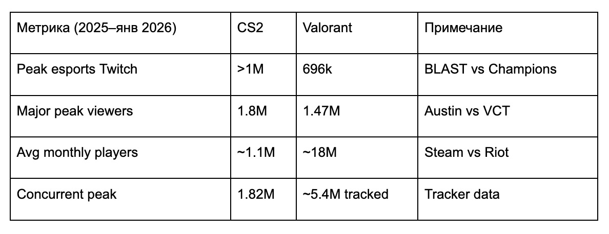 Получается очень живая картина: Valorant больше по игрокам, CS2 мощнее по зрительской концентрации.