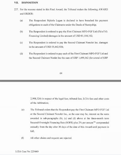 Согласно Окончательному Решению, Николай Лагун обязан уплатить истцам суммарно $117 млн. ($50 млн долга и остальные – проценты), а также свыше 3,5 млн фунтов стерлингов юридических расходов и арбитражных сборов.
