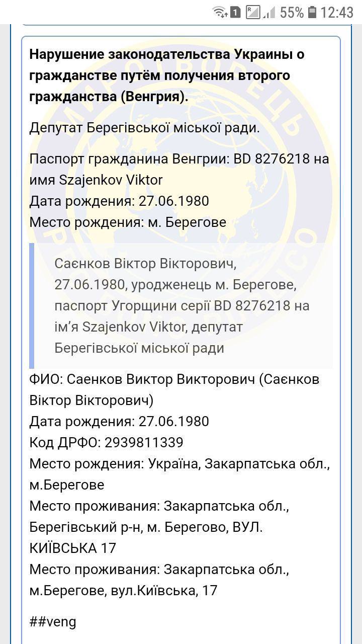 Оказывается, что Саенко из Берегова, которого сегодня задержали на переправку лиц через границу, имеет венгерское гражданство. Об этом сообщил Глагола со ссылкой на сайт "Миротворец".