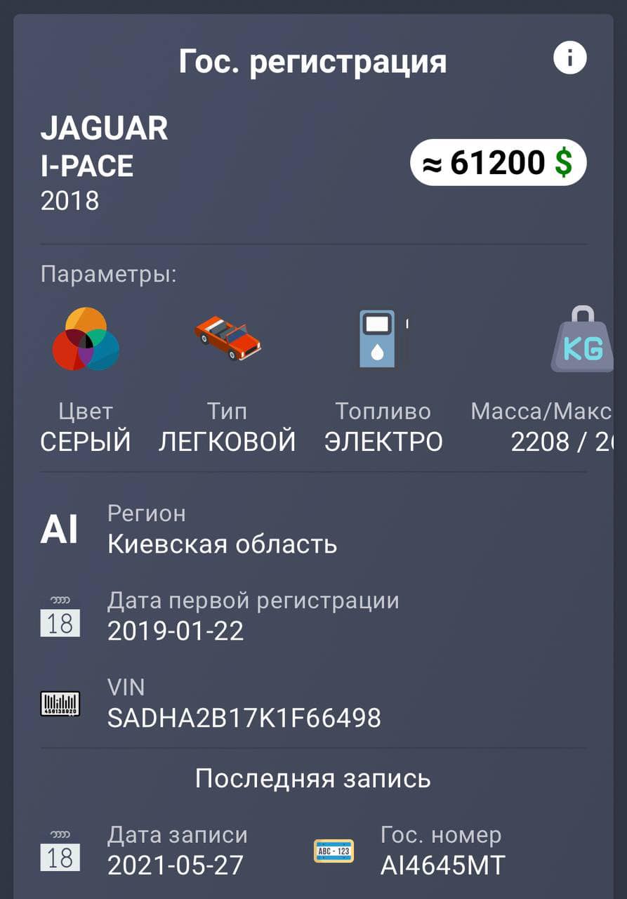 Стоит "хищник", за рулем которого заметили Василевскую-Смаглюк, более 60 тысяч евро. По нашим данным, этот автомобиль был зарегистрирован на ее брате 27 мая 2021 года.