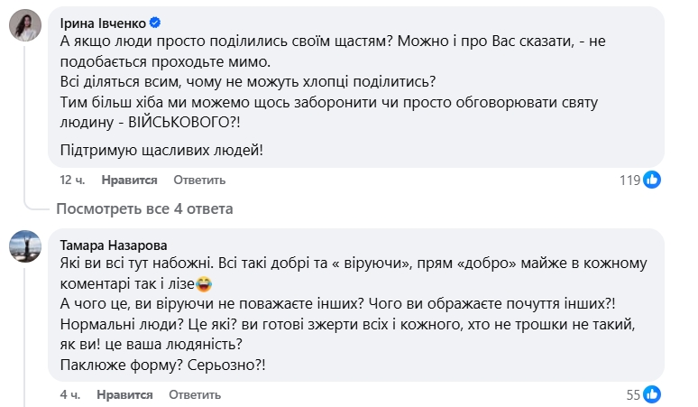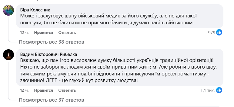 Экс-министр экологии Украины Игорь Шевченко отреагировал на публичную помолвку украинского певца Melovin с инструктором и парамедиком ВСУ Петром Злотем, назвав их «позором». Шевченко заявил, что публичное объявление об отношениях оскорбляет «чувства верующих и тех, кому просто неприятно на это смотреть». Его пост вызвало бурное обсуждение в социальных сетях.