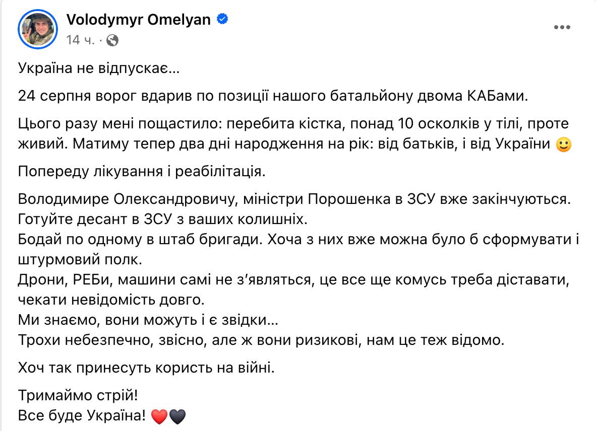 "Украина не отпускает… 24 августа враг ударил по позиции нашего батальона двумя КАБами. На этот раз мне повезло: перебита кость, более 10 осколков в теле, однако жив. Буду теперь два дня рождения в году: от родителей, и от Украины. Впереди лечение и реабилитация", - написал Омелян.