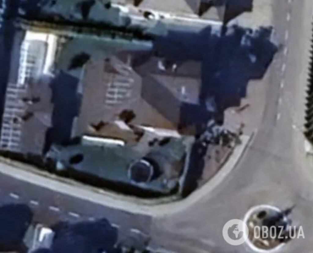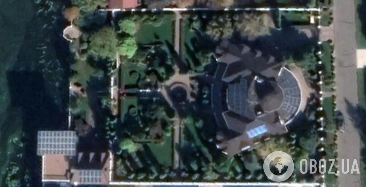 Согласно спутниковым снимкам, это здание расположено на общем земельном участке с соседним имением — оба здания имеют общий двор и ограждение. При этом соседний дом больше по площади и составляет 673,3 кв.м.