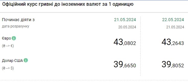 Официальный курс на 22 мая 2024 установлен на таком уровне: 39,8052 грн за 1 доллар (+0,1402 грн). Предыдущий максимум был зафиксирован ровно месяц назад, 22 апреля – 39,7879.