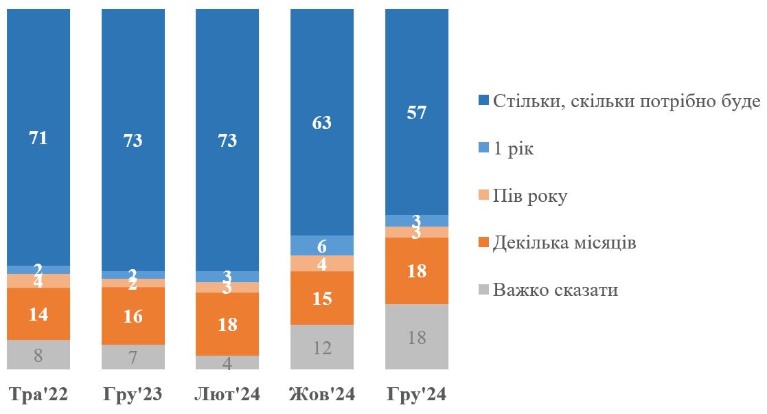 В течение осени 2024 года тенденция продолжала меняться. К декабрю 2024 года количество тех, кто заявил о готовности выдержать "столько, сколько нужно", снизилось до 57%. В то же время, доля тех, кто готов терпеть всего несколько месяцев или полгода, осталась почти неизменной — 21% в декабре против 18% в октябре.