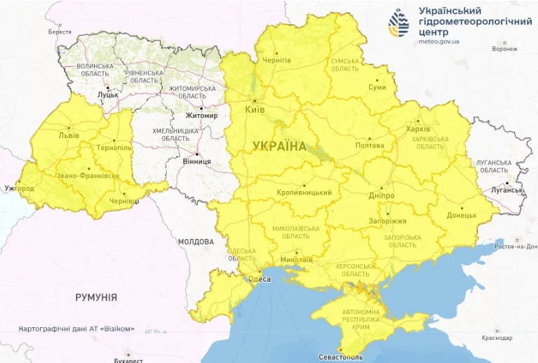 Желтый уровень опасности в Украине/ Укргидрометцентр