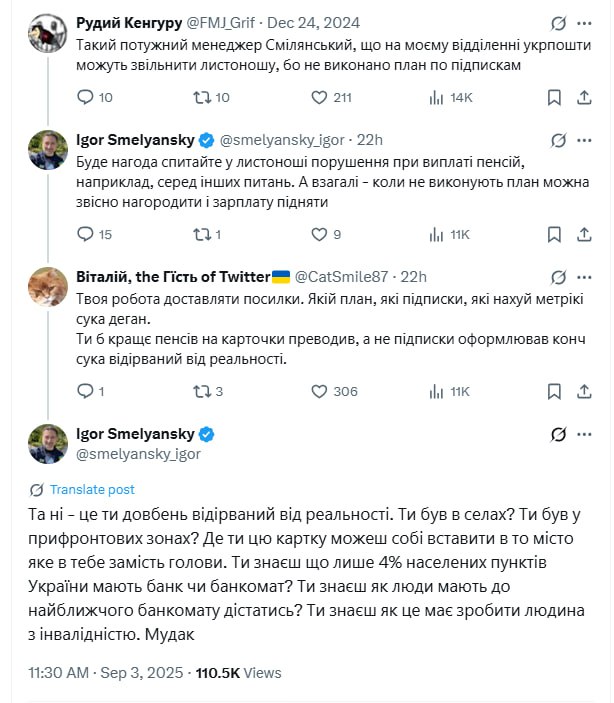 Руководитель «Укрпочты» Игорь Смелянский жестко ответил в соцсетях на критику относительно якобы увольнений почтальонов из-за низких показателей подписок. Он заявил, что доставка прессы и пенсий – это важная социальная функция компании, особенно в отдаленных селах, где отсутствуют банки и банкоматы.