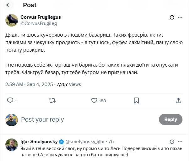 В ответ Смелянский резко отреагировал на эти упреки. Он назвал оппонента «долбнем», «мудаком» и «оторванным от реальности», подчеркнув, что такие комментарии не соответствуют действительности.