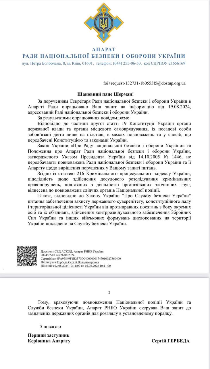 "Учитывая полномочия Нацполиции Украины и Службы безопасности Украины, Аппарат СНБО Украины направил запрос в указанные государственные органы для рассмотрения в установленном порядке", - говорится в письме.