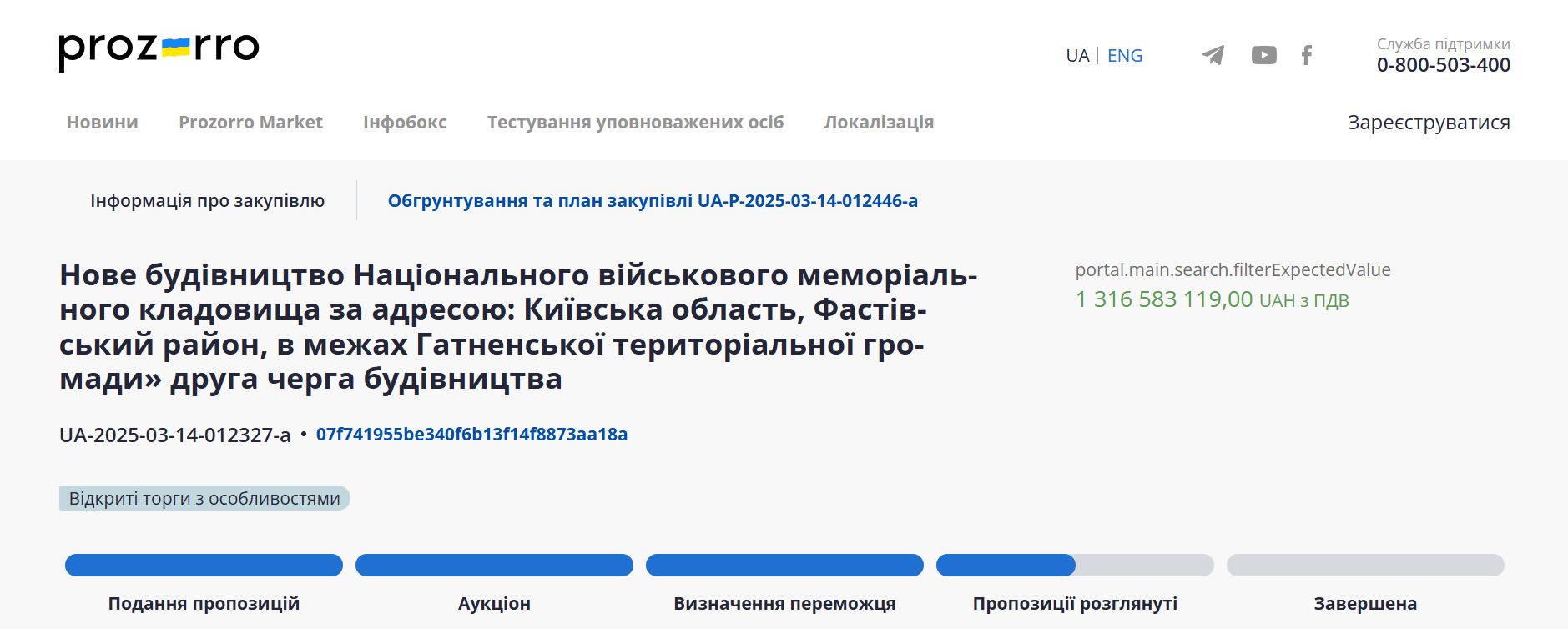 Об этом сообщает Интерфакс со ссылкой на данные системы публичных закупок Prozorro.