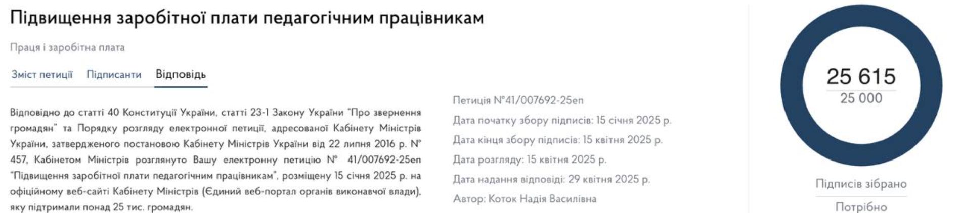 Кабинет Министров Украины сообщил, что пока нет финансовой возможности повысить зарплаты работникам сферы общего среднего образования. Об этом говорится в ответе на электронную петицию, собравшую более 25 тысяч подписей.