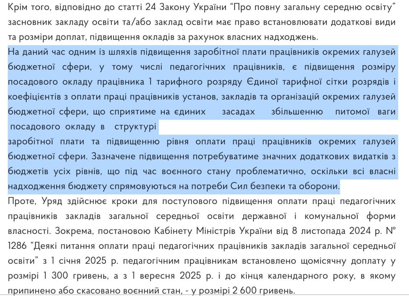 В Кабмине также отметили, что педагогам предусмотрены разные доплаты, однако повышение должностных окладов требует значительного дополнительного финансирования из государственного и местных бюджетов.