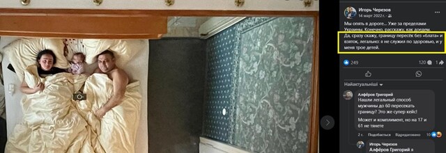Очевидно, этими словами эксадвокат хотел напомнить, что отец трех и более несовершеннолетних детей может уехать из Украины, даже если дети родились в разных браках (у самого Черезова младшая дочь родилась за несколько месяцев до начала войны). Но есть нюанс. При пересечении границы важно документально подтвердить как отсутствие задолженности по алиментам, так и сам факт содержания или воспитания всех детей. А вот здесь у Игоря Черезова были явные проблемы, ведь известно, что от одного своего ребенка от другого брака знаток законов отказался, так что по факту мог доказать лишь то, что опекает двух детей, чего для легального пересечения границы было явно недостаточно.