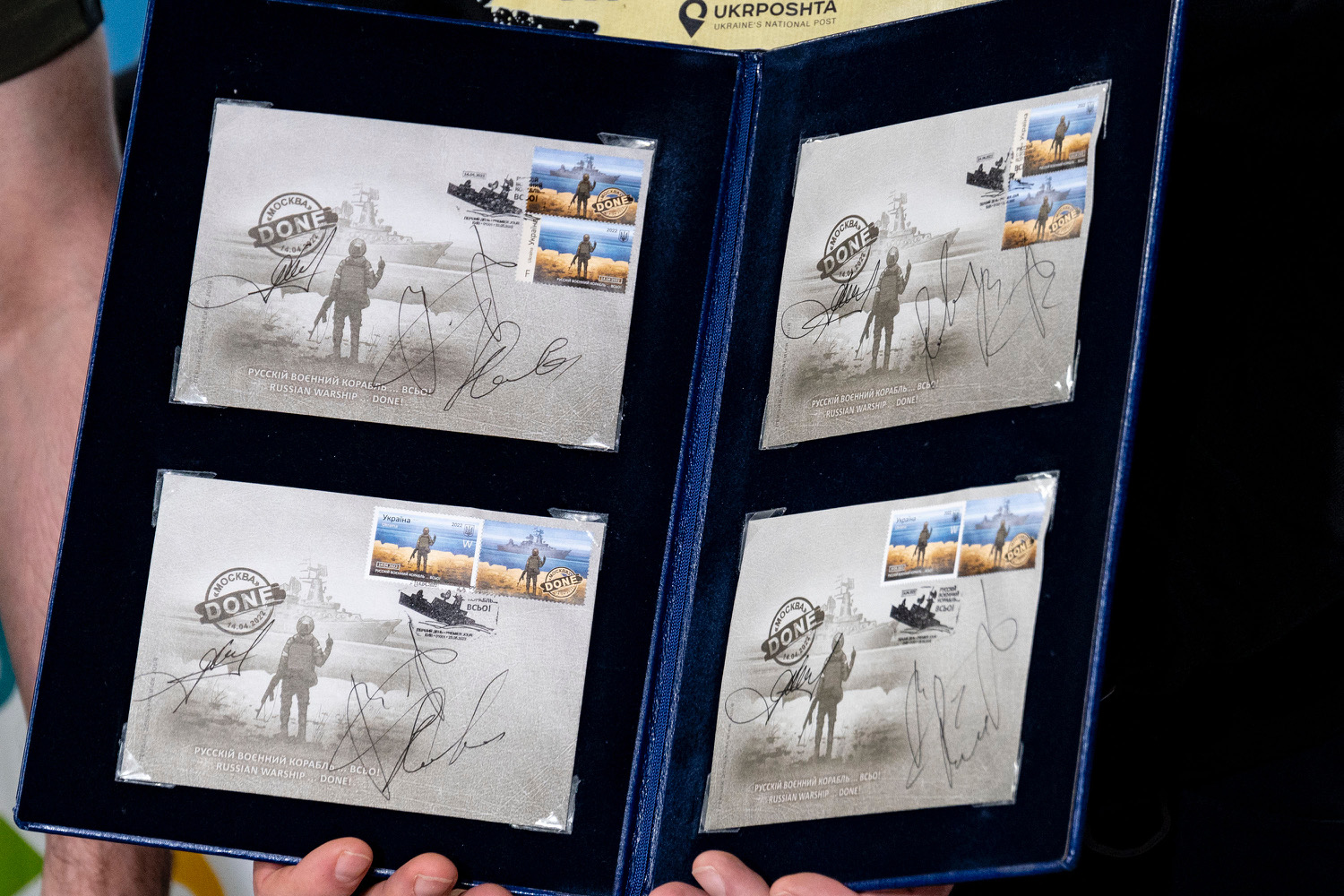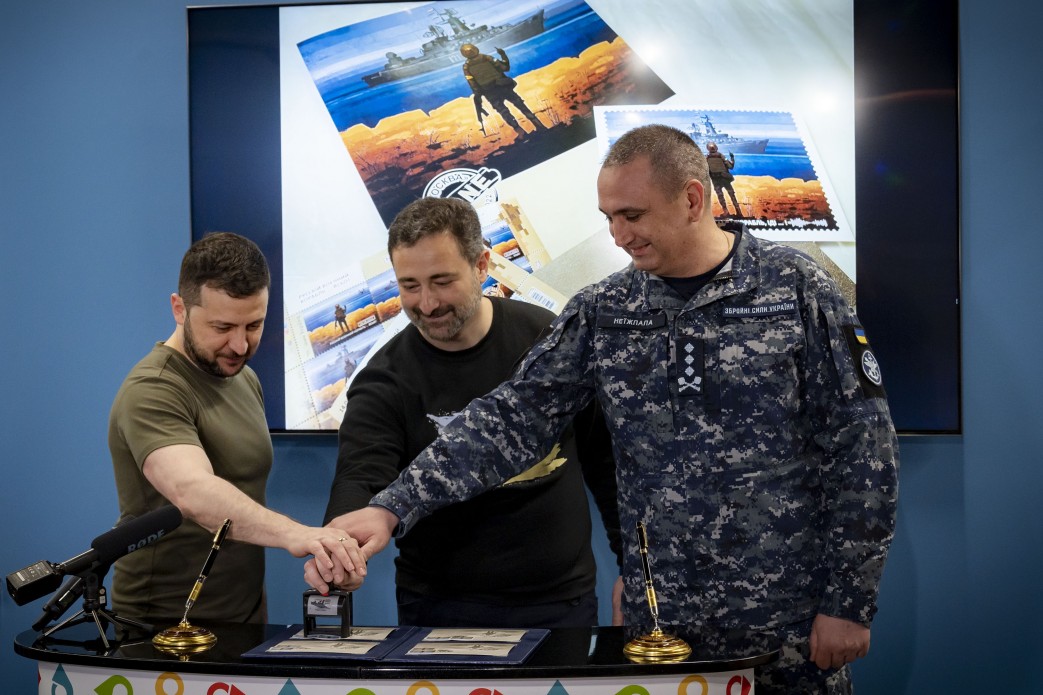 В спецпогашении марок "Русский военный корабель… Все! Смерть врагам!" для отправлений по Украине и "Русский военный корабель… Все! Слава нации!" для международных отправлений принял участие президент Украины Владимир Зеленский. Эти марки будут выпущены общим тиражом 5 млн экземпляров.