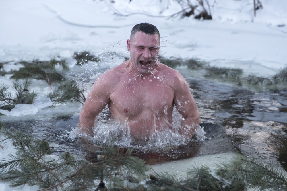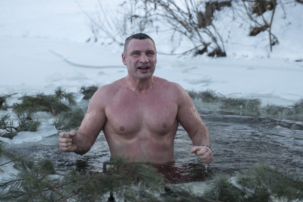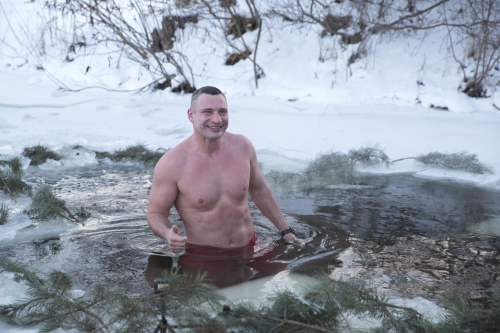 Мэр Киева Виталий Кличко утром нырнул в прорубь в заливе возле парка Дружбы народов и поздравил украинцев с Крещением.