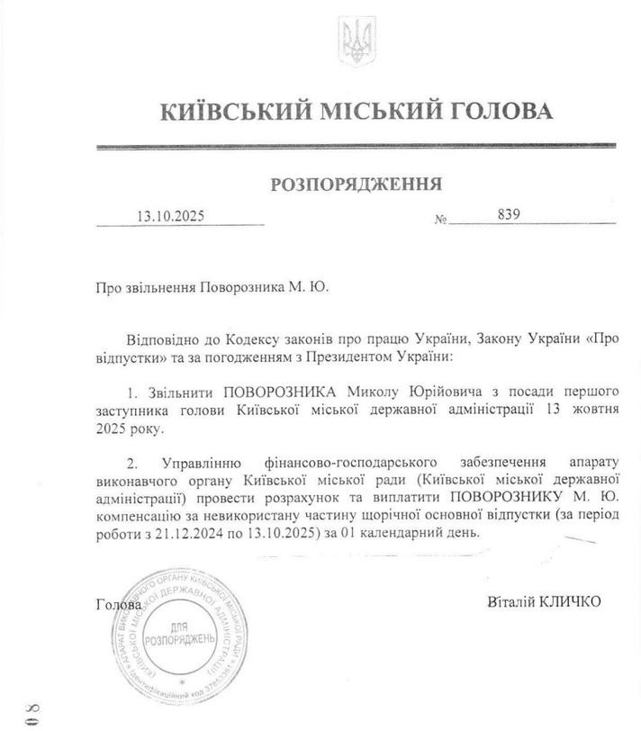 «Уволить Поворозника Николая Юрьевича с должности первого заместителя председателя Киевской городской государственной администрации 13 октября 2025 года», – говорится в документе.