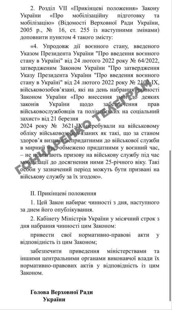 "Также в законопроекте предусмотрено право на увольнение для тех, кого успели забрать, пользуясь той позорной нормой. И теперь этот документ должны рассмотреть в сессионном зале. Буду делать все, чтобы это произошло сразу, как только соберется парламент", - написал он.