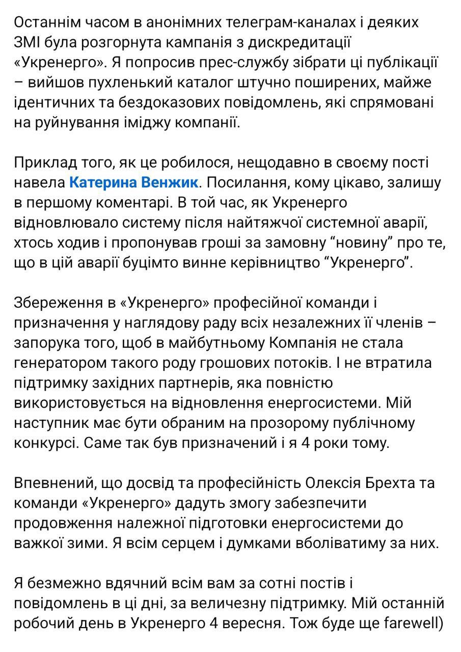 В заявлении, опубликованном на его странице в Facebook 3 сентября, он отметил, что у наблюдательного совета (НС) не было вопросов до отчета о защищенности подстанций компании. Он также подчеркнул важность независимого управления "Укрэнерго" и назначения всех независимых членов НС, чтобы Украина не потеряла поддержку международных партнеров.