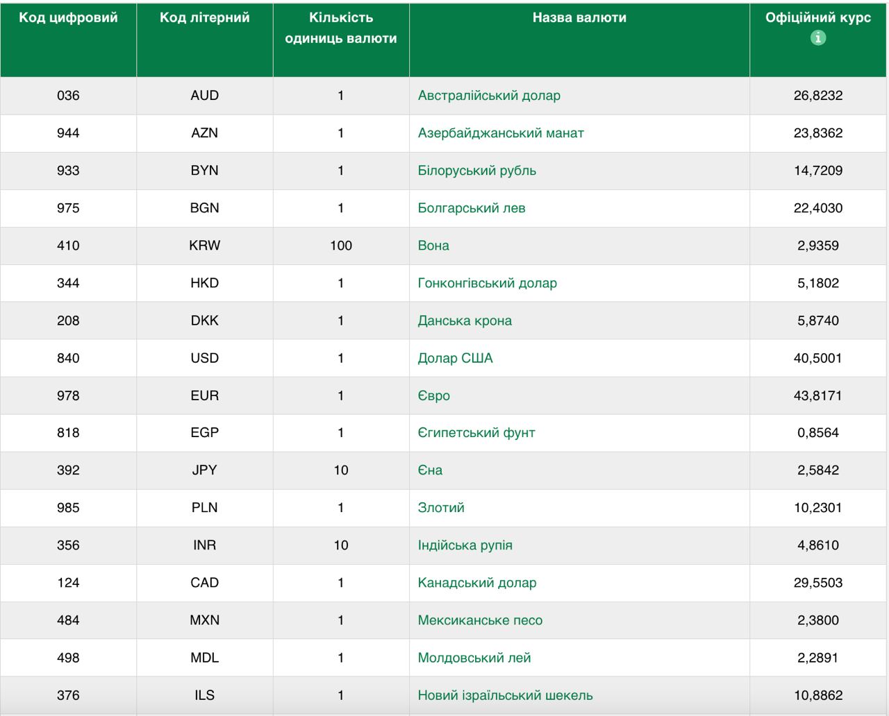 В НБУ сообщают, что сегодня доллар США стоит 40,5001 грн, а за один евро – 43,8171 грн. Кроме этого, за один польский злотый (PLN) – 10,2301 грн; молдавский лей (MDL) – 2,2891 грн; румынский лей (RON) – 8,8049 грн.