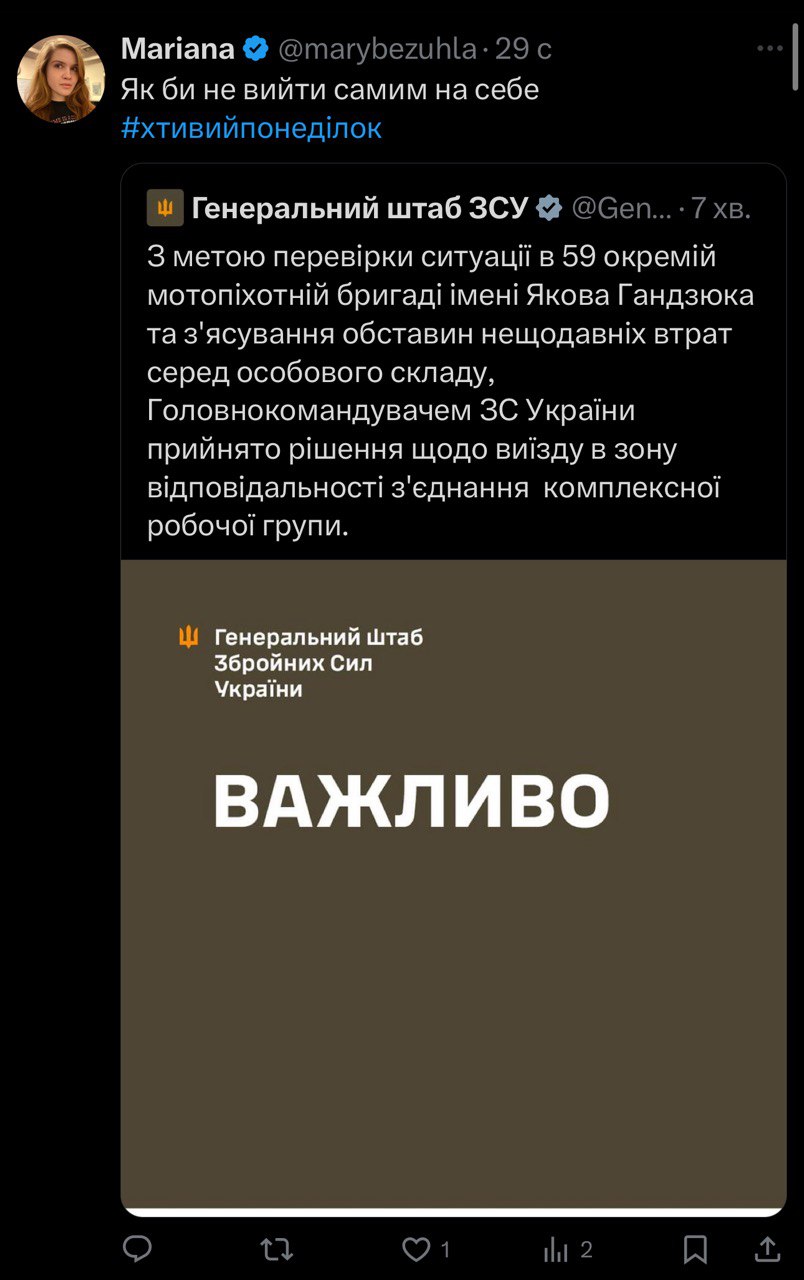 "Як би не вийти самим на себе? #хтивийпонеділок”, – написала нардепка, поделившись сообщением от Генерального штаба ВСУ о проведении служебной проверки в 59-й отдельной мотопехотной бригаде имени Якова Гандзюка, чтобы выяснить обстоятельства недавних потерь среди личного состава бригады.