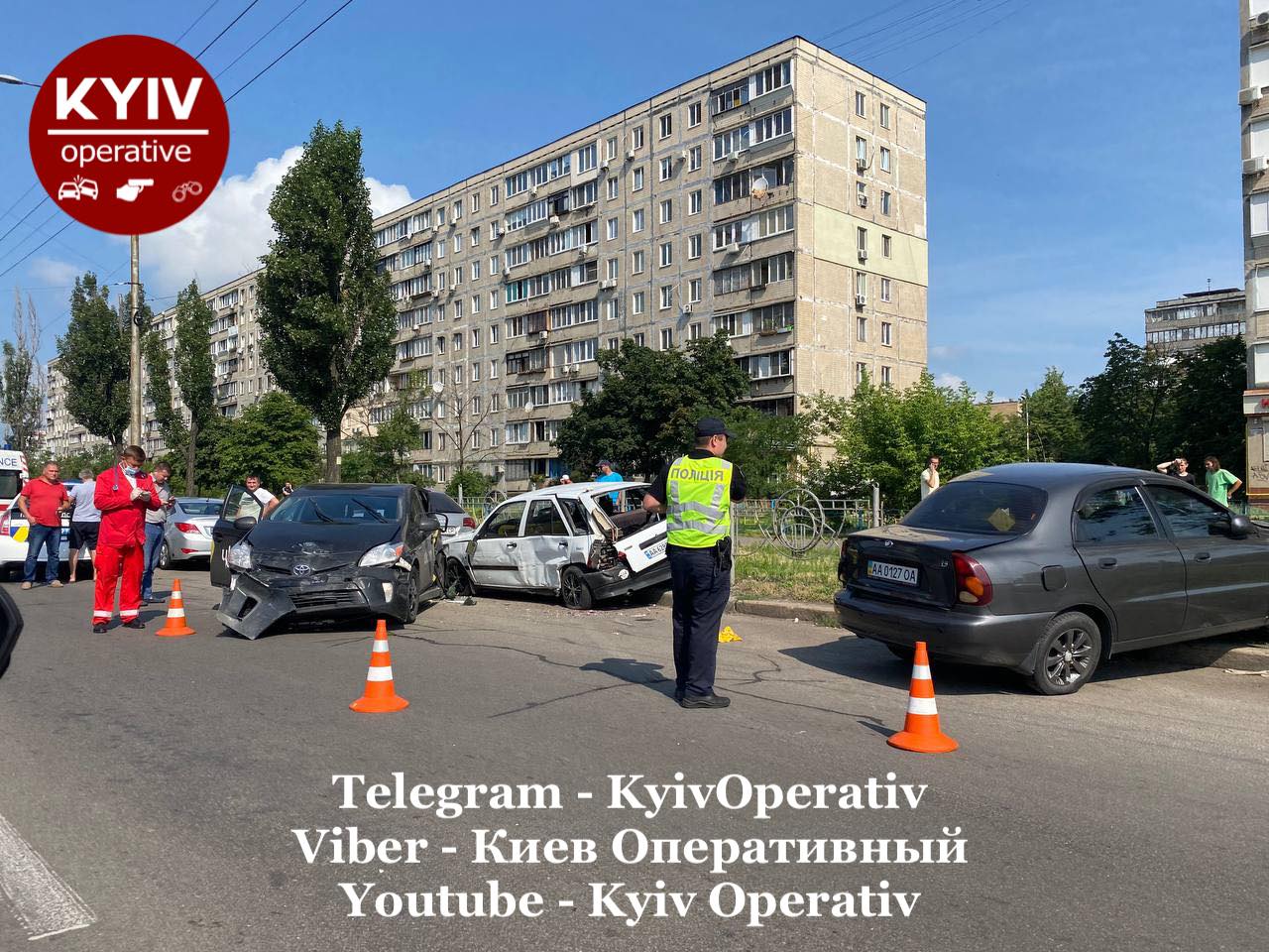 Между тем свидетели аварии сообщают, что на Оболони таксист на Toyota Prius попытался проехать на красный сигнал светофора, но не успел "проскочить" и задел автомобиль Audi. В результате столкновения Toyota отбросило в припаркованный Daewoo, Fiat и в Audi.