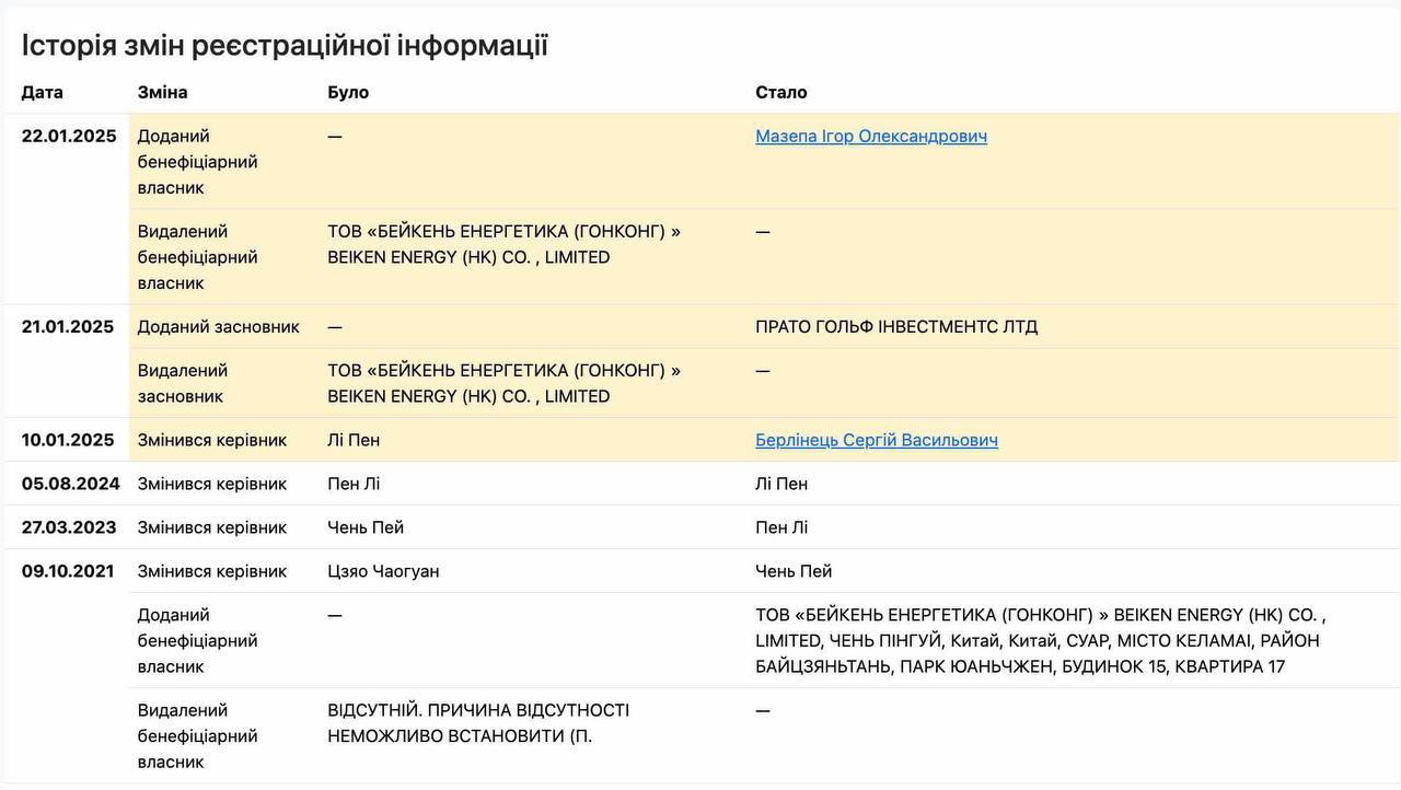 Дело в том, что 22 января 2025 года концом бенефициаром украинской дочери китайского ООО "Бейкень Энергетика" внезапно стал основатель Concorde Capital Игорь Мазепа (параллельно подозреваемый ДБР по делу о присвоении земельных участков для строительства коттеджного города).