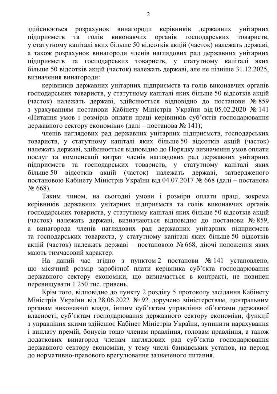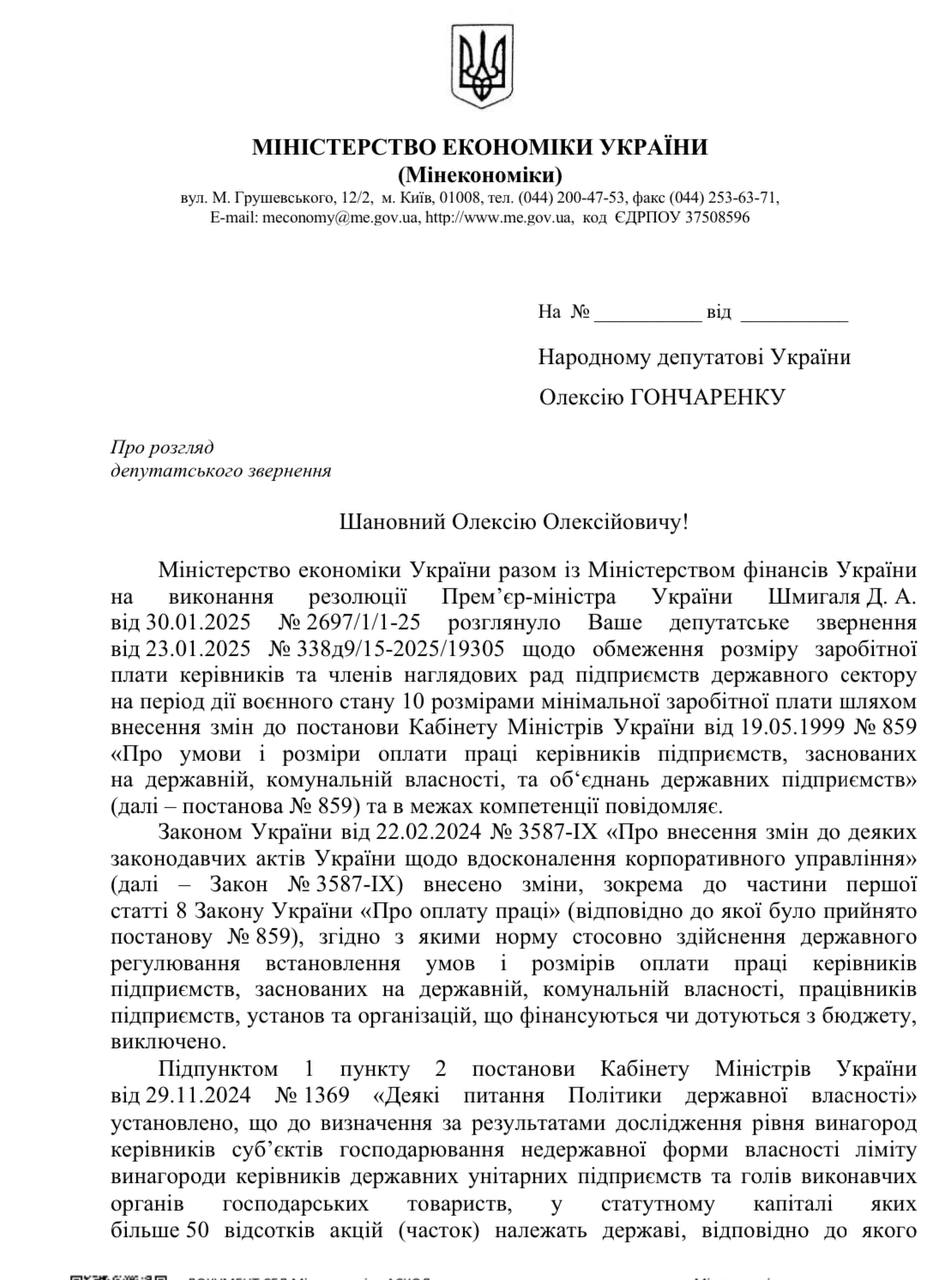 "Смелянский и другие руководители госкомпаний продолжат получать миллионы во время войны. Получил ответ на свое обращение. Предлагал внести изменения в постановление Кабмина, чтобы зарплата руководителей госпредприятий на период военного положения была не более 10 минимальных зарплат - то есть не более 100 тысяч гривен (как у военных на передовой). собираются. Потому что экономить можно только на военных, медиках, педагогах, но не на топах госкомпаний", – написал Гончаренко, обнародовав официальный ответ министерства.