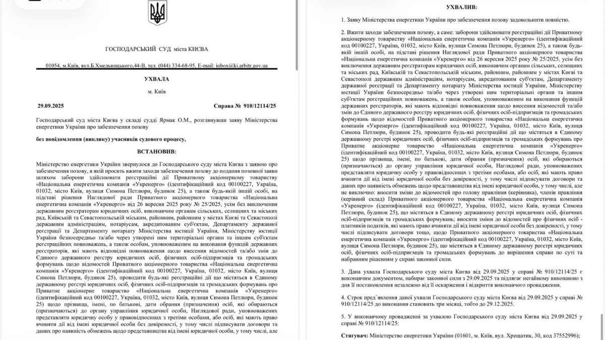 Хозяйственный суд Киева 29 сентября поддержал Министерство энергетики и запретил выполнять решения наблюдательного совета НЭК «Укрэнерго» об увольнении руководства компании – Виталия Зайченко. Суд приказал государственным регистраторам не производить никаких действий на основе этого решения от 26 сентября 2025 года. Таким образом, кадровые изменения пока не могут произойти.