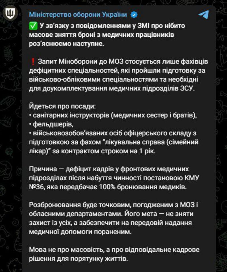 В своем Телеграмм канале Министерство обороны Украины отреагировало на новости о массовом разбронировании медиков.