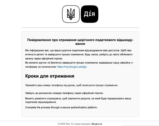 Украинская налоговая служба предупреждает граждан о новой мошеннической схеме: злоумышленники массово рассылают поддельные электронные письма, выдаваемые за официальные сообщения от портала "Дія".