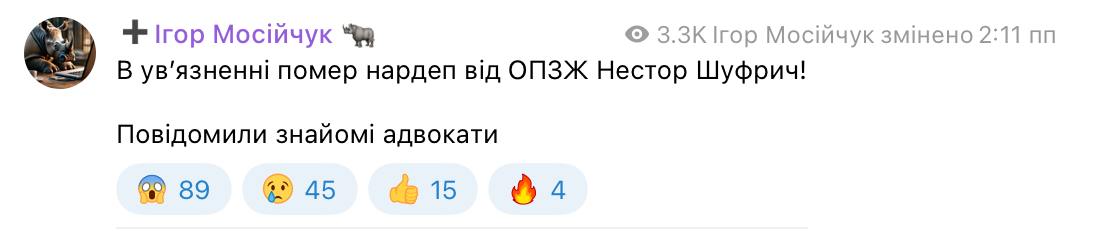 Бывший народный депутат Игорь Мосийчук сообщил, что умер Нестор Шуфрич, уже год находящийся в СИЗО по подозрению в государственной измене. Однако уже через несколько минут опроверг свою информацию.