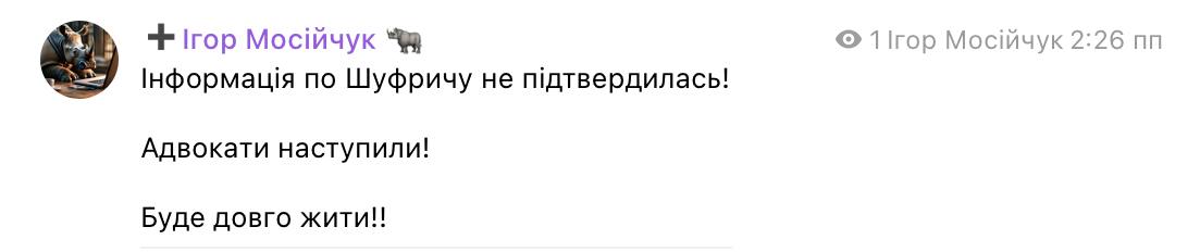 Однако уже через несколько минут Мосийчук опроверг свои слова, заявив, что информация о Шуфриче не подтвердилась.
