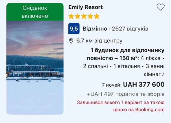 Также шокирующие цены на популярном курорте Emily Resort во Львове, где стоимость отдыха за 7 ночей составляет 377 600 грн.