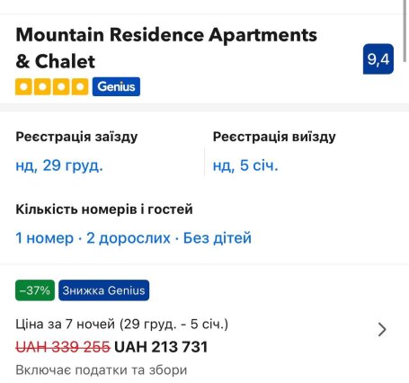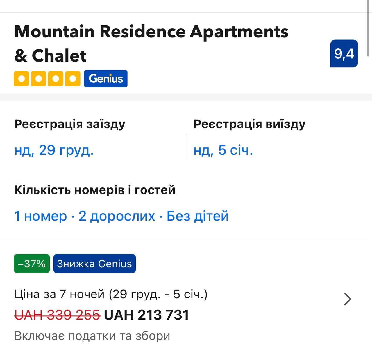 - Размещение в Mountain Residence Apartments & Chalet в апартаментах с одной спальней стоит 339 255 грн без скидки или 213 731 грн со скидкой.