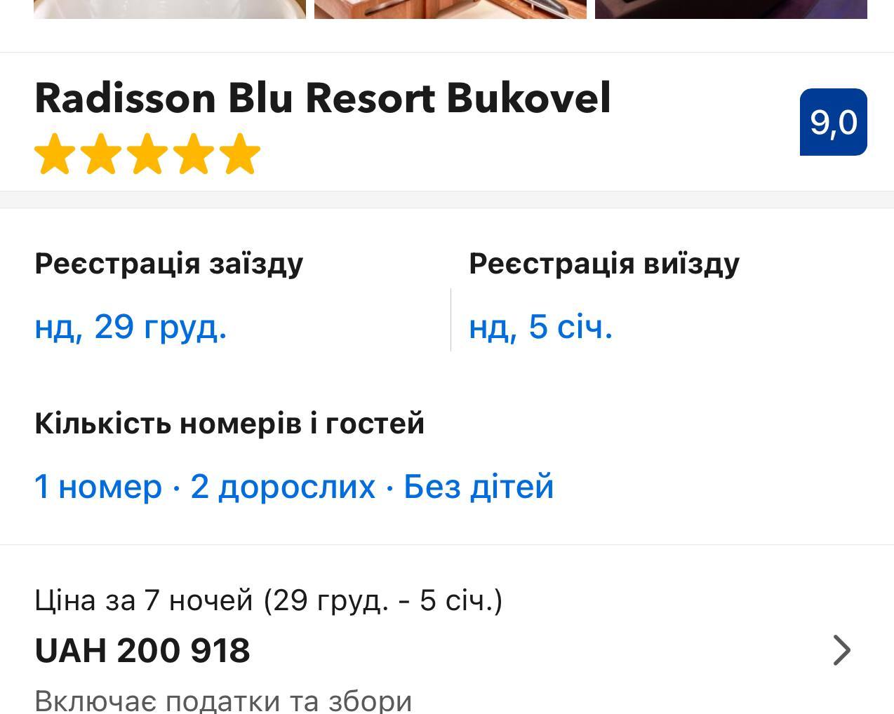 - Стоимость недельного проживания в Radisson Blu Resort Bukovel на двоих составляет 200 918 грн.
