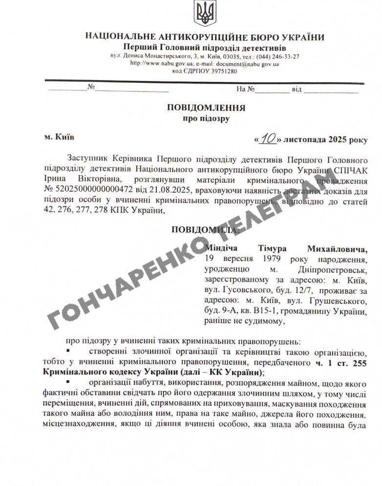 По словам нардепа, подозрение включает в себя пять ключевых эпизодов, которые следствие считает доказательствами системной деятельности Миндича в составе преступной группы.