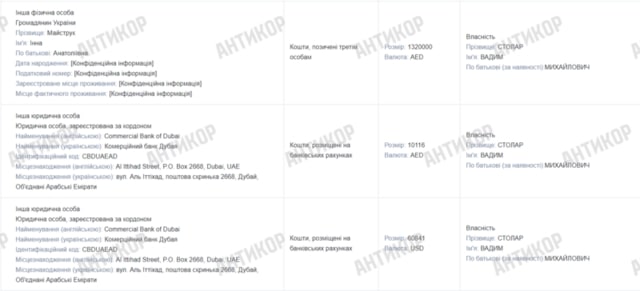 Судя по всему, семья Столара также переехала в Дубай, поскольку он декларирует большие суммы, заимствованные ему бывшей женой Инной Майструк в валюте ОАЭ.