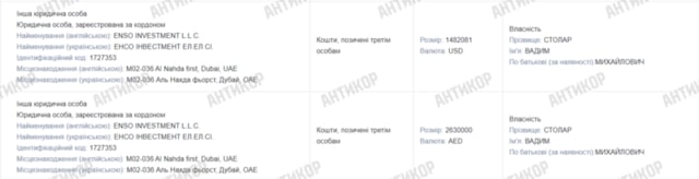 Столар отметил, что компания Enso investment LLC ссудила ему 1,5 млн долларов и 2,6 млн дирхамов, что по курсу составляет 716 тыс. долларов.