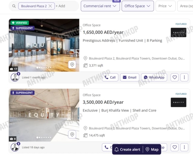 По данным сайтов недвижимости в Дубае, арендовать офис в Boulevard plaza 2 в зависимости от площади можно, например, за 450 000 долларов в год, или даже за 950 000 долларов. Как рассказал журналистам "Антикора" местный брокер, более элитная офисная недвижимость может быть только в Бурдж Халифе. «Но большинство богатых клиентов обычно выбирают здания напротив Бурдж Халифы. Если ты арендуешь или живешь в ней, ты ее не видишь. А если у тебя офис в Boulevard plaza, то ты можешь видеть и башню, и Dubai mall и этот вид действительно стоит безумных денег», - говорит он.