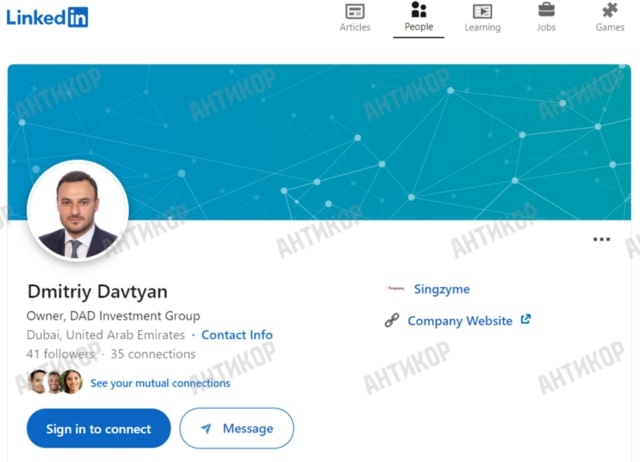 В его профиле на LinkedIN отмечено, что он является представителем DAD Investment Group. Это компания его отца – Александра Давтяна. Однако Дмитрий постоянно понравится публикации от Enso investment в Дубае.