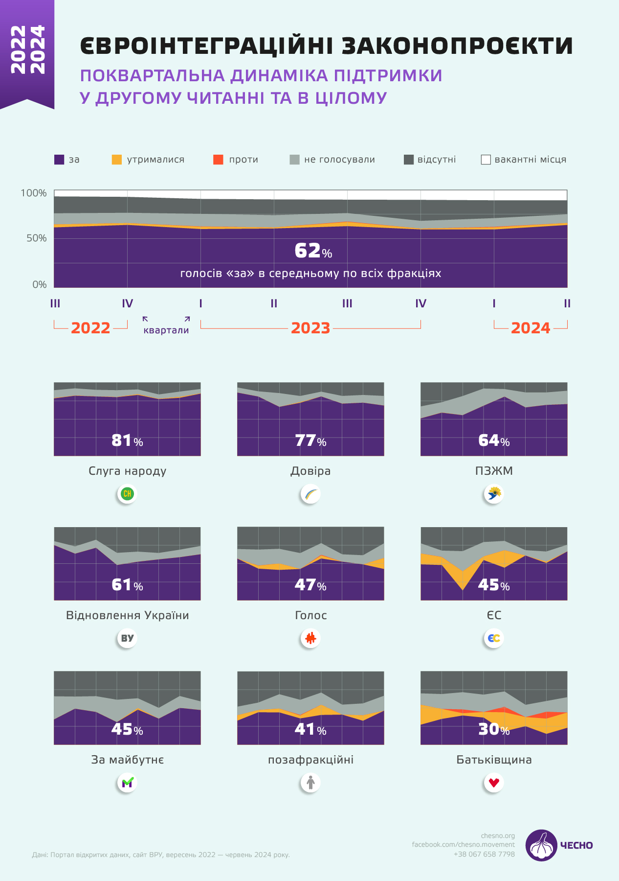Аналитики организации объясняют низкую поддержку евроинтеграционных инициатив отсутствием депутатов от "ЕС" на голосованиях, их содержанием или игнорированием законопроектов, направленных на адаптацию украинского законодательства к стандартам ЕС. Меньше представителей "Европейской Солидарности" за эти законопроекты голосовали только внефракционные депутаты.