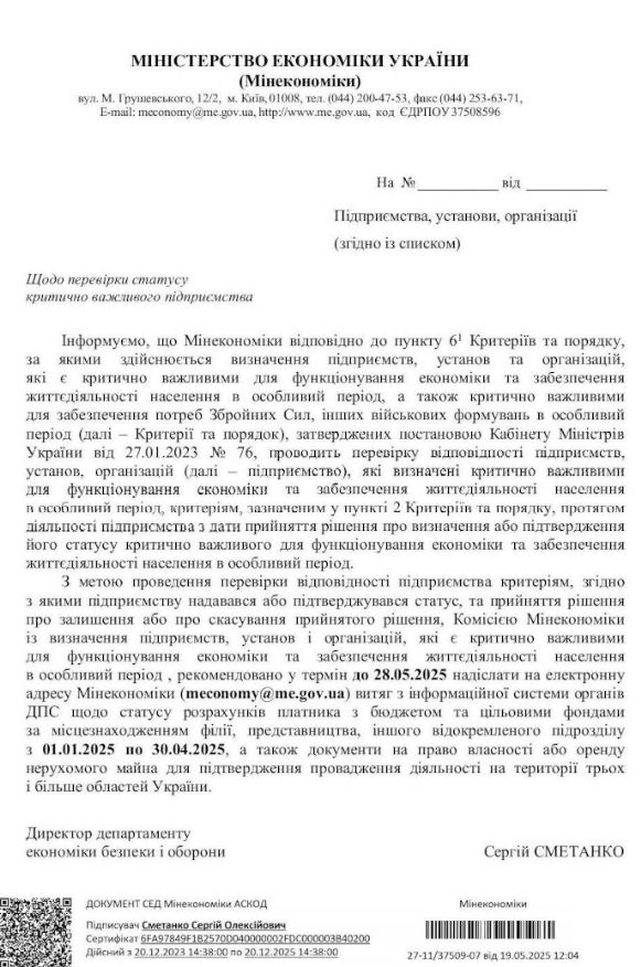 Министерство экономики проводит проверку предприятий на предмет соблюдения критериев, необходимых для сохранения статуса критически важных. В рамках мониторинга предприятия должны прислать документы по адресу [email protected] до 28 мая.