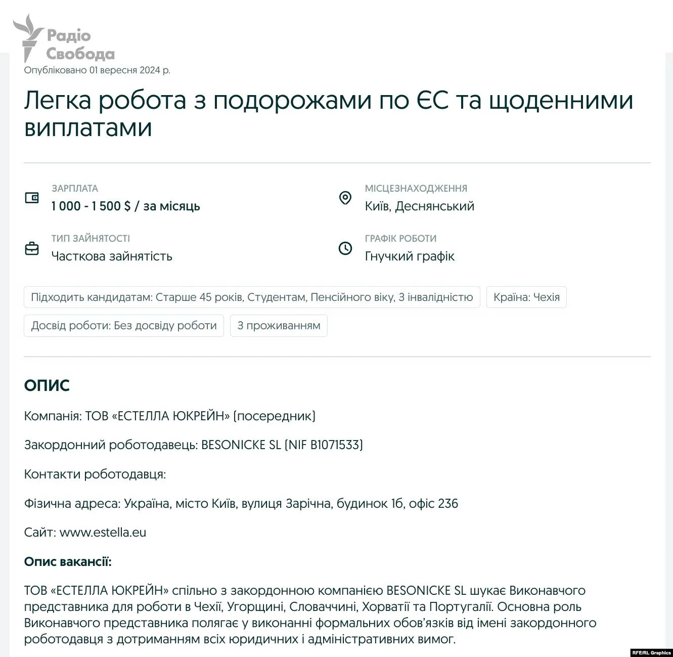 Однако, как выяснилось, это не совсем так, уверяют расследователи. В частности, уже в 2024 году "Эстелла Юкрейн" заключала соглашения с "брендами", связанными с израильско-европейской сетью кибермошенников, а также оплачивала маркетинговые услуги. Кроме того, в 2024 году "Эстелла Юкрейн" предлагала 1000-1500 долларов и "легкую работу с путешествиями в страны ЕС" - за подписание документов от имени испанской фирмы Besonicke SL, также фигурирующей в истоке как связанная с кибермошенничеством.