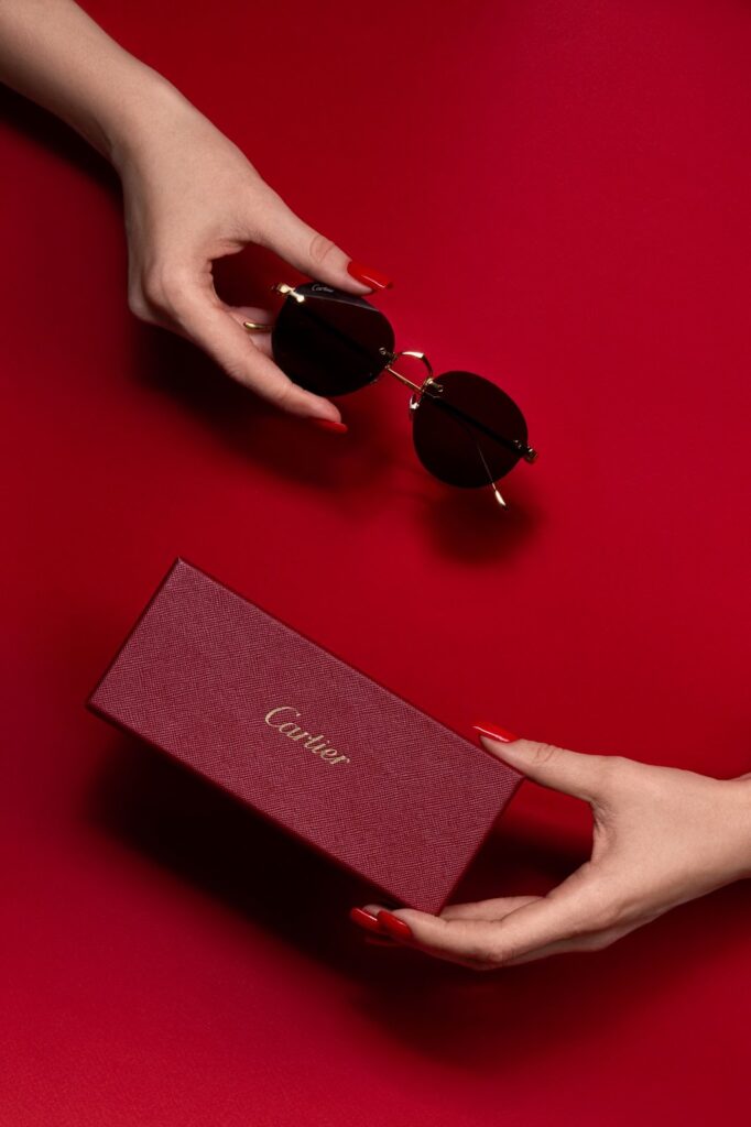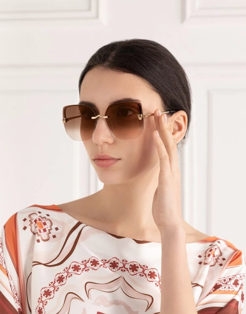Мотив пантеры — подпись коллекции Panthère de Cartier, символизирующая элегантность и силу. Винтовые детали, вдохновленные часами Santos, добавляют нотку индустриального шика. Классический переплетенный логотип в виде буквы С, излучающий сдержанную изысканность. Геометрические фигуры, включая кошачий глаз, овальные и крупные оправы, подходящие к ультрамодным образам.